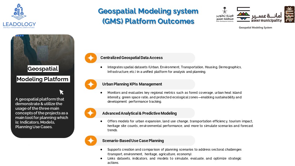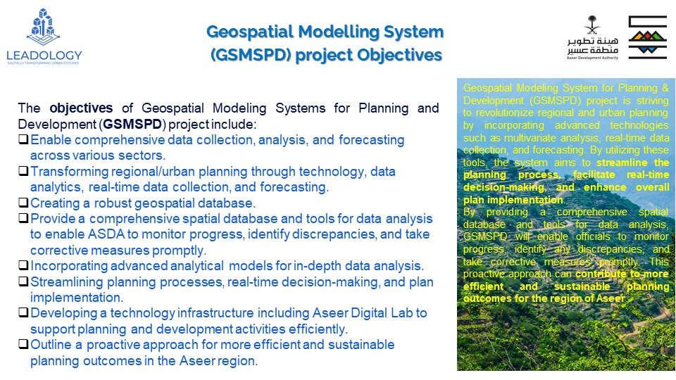 The GSMSPD Project is a transformative 18-month initiative that delivered a geospatial digital twin ecosystem for the Aseer Region, empowering ASDA with real-time, data-driven planning aligned with Vision 2030.