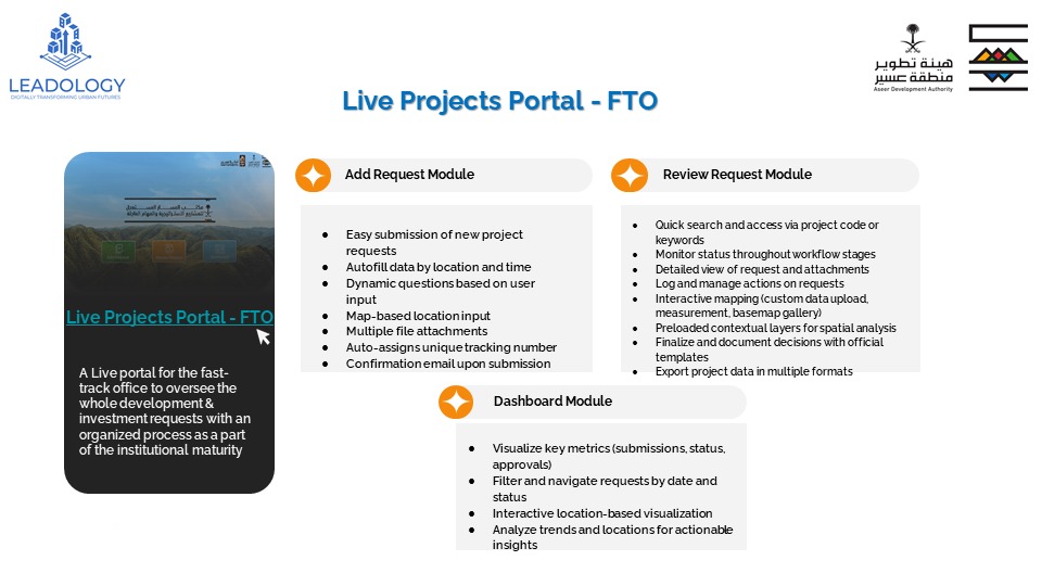 A dedicated portal for managing and tracking high-priority projects in Aseer, supporting ASDA’s Fast Track Office.